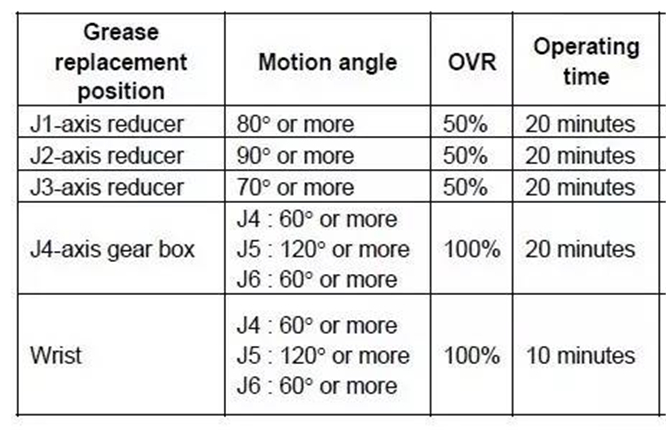 1. 當(dāng)正常使用的機(jī)器人運(yùn)行時(shí)間達(dá)到1萬(wàn)小時(shí)或使用3年時(shí)需要更換本體減速機(jī)內(nèi)部潤(rùn)滑油,根據(jù)機(jī)器人實(shí)際使用環(huán)境適當(dāng)縮短保養(yǎng)間隔周期。
