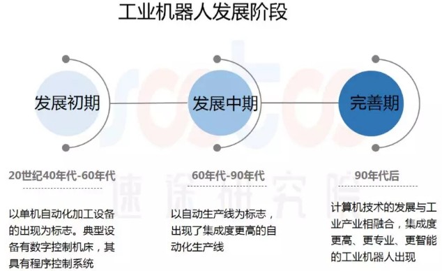 20世紀(jì)40年代到60年代是工業(yè)機器人發(fā)展的初期,以單機自動化加工設(shè)備的出現(xiàn)為標(biāo)志,典型的設(shè)備為1952年麻省理工研制的數(shù)字控制機床,其具有程序控制系統(tǒng)。相比于傳統(tǒng)手工業(yè),自動化加工設(shè)備的優(yōu)勢更加明顯,更加能適應(yīng)批量化生產(chǎn)的需要,并逐漸取代了人工的位置。