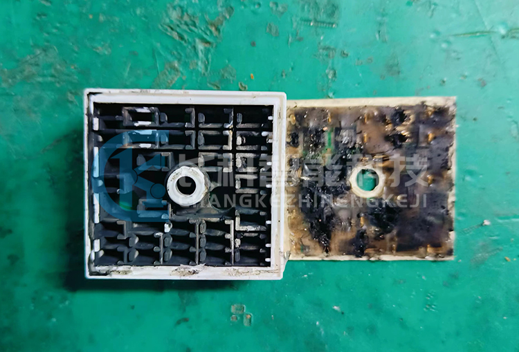 After receiving the driver KSP600-3x20, we opened it and found that one of the SEMICON IGBT modules was burnt out. It seems that the power consumption was instantly too high, and the heat could not be dissipated, causing the internal temperature to be extremely high, producing gas that broke through the shell and caused an explosion.